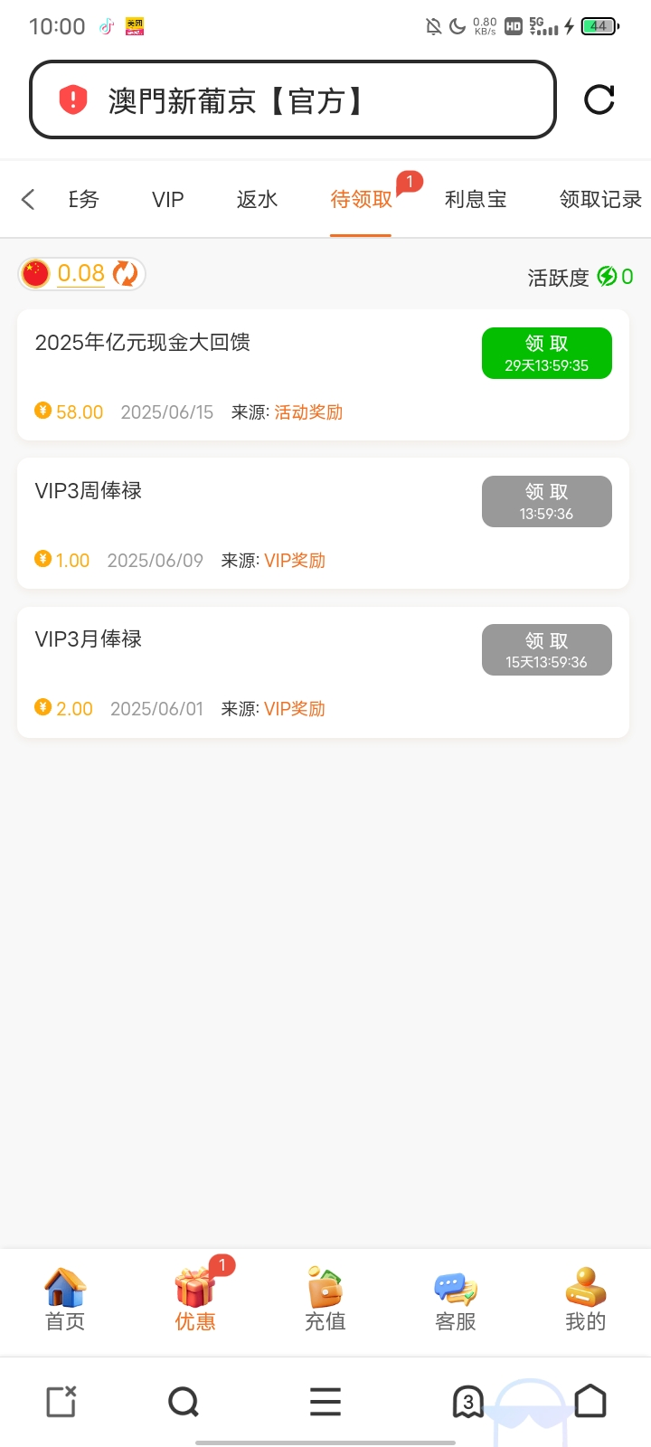 每月15日会员日,一个月内有投注的别忘了上线领取,领了58