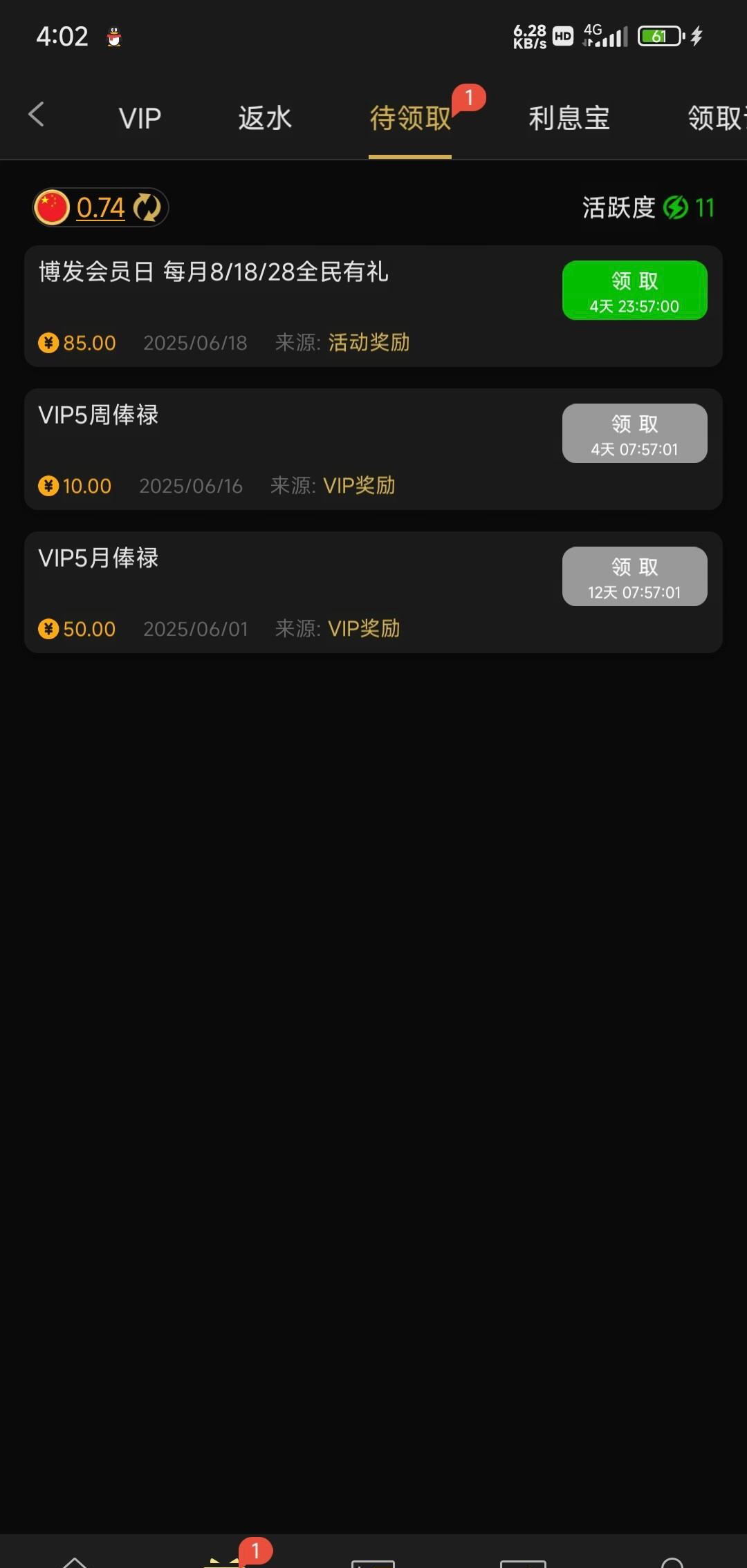现在好像改规则了,我v5每次都是85,之前都是看充值打码送,现在好像是看vip等级送?各位老哥去领