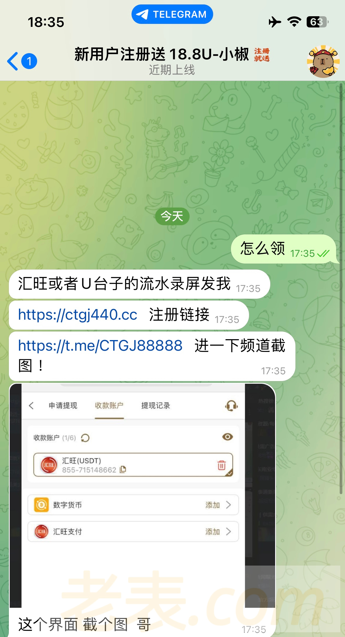 飞机专员:@xiaoa669 自己看,要求在图片里面 五倍流水 只能电子捕鱼 最低最高68u 用的u台流水就送了 没打出来